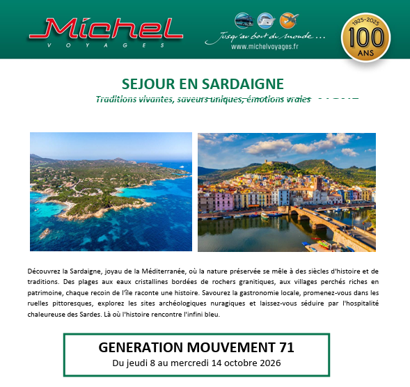Quoi de nouveaux sur le site ou à venir (mise à jour en continu) Possibilité de prêt de matériel pour les clubs (voir avantages)Dans informations générales : dates indiquées sur les produits : DLC , DDM …SEJOUR VVF à Piriac, il reste des placesOrganisation d’une formation pour créer un site pour vos clubs, voir activitéMise à jour des manifestations des clubsLa fédération prépare un Thé Dansant à Massilly le 23 avril 2026 Information de la Fédération Nationnal Renseignements sur la fédération départementale de S et L .Fédération départementale Immeuble FFB 94 Rue de Lyon 71000 MACONPermanence les lundis de 9 h à 12 hTéléphone : 03 85 34 62 58Email : generations-mouvement.fede71@orange.fLe bureau de la fédération est ouvert les lundis de 9 h à 12 h Comment s'inscrire à la fédération départementale Vous pouvez prendre votre inscription dans un club affilié à la fédération(voir liste des clubs) ou bien « en individuel » Inscription individuelle Buletin d'inscription individuelle 2026 Assemblée Générale de la fédération Elle aura lieu à Cluny le 2 avril 2026 à l’Espace Griottons Voyages, sorties, séjours : voir activités + voyages Voir les voyages et sorties nationaux et départementaux.. Il reste 3 places Séjour VVF à PIRIAC et INSCRIPTION Nouveau voyage Voyage en SARDAIGNE du 8 au 14 OCTOBRE 2026 Voir le programme Voyage en SARDAIGNE FICHE D'INSCRIPTION à renvoyer IMPERATIVEMENT auprès des CARS MICHEL Voyage en SARDAIGNE Fiche d'inscription à complèter et à faire auprès des CARS MICHEL COMPLET Voyage en ISLANDE COMPLET Voyage à OBERNAI COMPLET Croisière fluviale en BELGIQUE Activités diverses THE DANSANT à Massilly le 23 avril organisé par la fédération Générations Mouvement de S et L VOIR L'AFFICHE DU THE DANSANT dans activités des clubs FORMATION SAGA « SITE WEB » pour créer un site pour votre club VOIR L'ANONCE dans activités/formation Voir la Vie des secteurs Vie du secteur Bresse-Chalon Vie du secteurs Mâcon-Cluny Vie du secteur Autun-Charolles Voir les activités des clubs et leurs manifestations(affiches,photos...) Voir la vie des clubs, affiches des manifestations ... Concours départementaux proposées par la fédération de S et L CONCOURS de connaissances 2025 CONCOURS TERMINEE Réglement du concours 2025 Questionnaire connaissances 2025 CONCOURS photos 2025 CONCOURS TERMINEE Règlement du concours photos 2025 CONCOURS de dictées 2026 La finale départementale aura lieu le 30 mars à Mâcon Courrier aux Présidents Inscription à la dictée 2026 Règlement du concours de dictées CONCOURS de pétanque 2026 Le concours 2026 aura lieu en Bresse. Le lieu est à Simandre et la date retenue est le Mercredi 10 juin en 4 parties, 2 le matin et 2 l’après midi La fiche d'inscription et l'affiche du concours vont venir Lorem ipsum dolor sit amet, consectetur adipiscing elit. Ut elit tellus, luctus nec ullamcorper mattis, pulvinar dapibus leo.